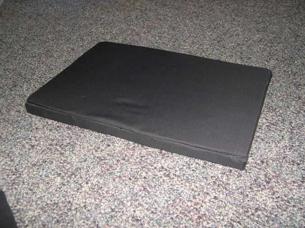 He hecho una tapa que pensé que le puse el portátil en. He decidido que parecía mejor ajuste a la laptop en la pieza inferior sin tapa, pero mantuvo la tapa alrededor en caso de que quiero tener algo para colocar sobre el marco cuando el portátil no está en él. Puede ver una pequeña abolladura en la tapa porque corté agujeros en el cartón de la tapa para mejorar la ventilación debería fijar el portátil en ella. Si no necesita acceso al interior de la base simplemente podría estirar paño pelada en la parte superior y use chinchetas para sujetar, lo que maximiza la circulación de aire.