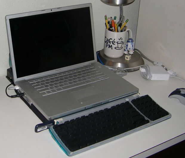 Configurar el portátil en la parte superior y listo. Ahora puede sentarse, relajarse y tenemos que mirar unos cuantos menos cables. Además, tengo acceso a mi unidad óptica. Y, a pesar de estar hecha de cinta y cartulina, el soporte sigue siendo bastante resistente debido a la buena estructura.