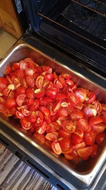 Tengo ollas de gran restaurante estilo [tipo utilizado en cocinas y empresas de catering... sobre 12 "x 20" x 4" profunda]; Si no tienes estos, usted puede utilizar 9 x 13 utensilios utilizados para cakes/brownies...just ajustan cuántas necesitará. Generalmente Compro 30# de tomates y que llenará 2 de mina; # 20 lleno de 1 pan 4" de profundidad y 1 pan 2" profundo.