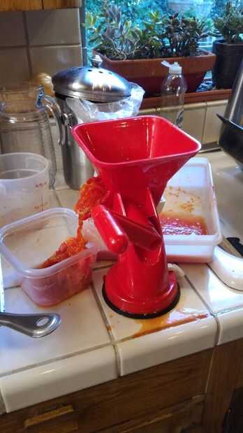 Utilizar una prensa de tomate Passatutto (hecho en Italia) que compré años atrás en William Sonoma; Acabo de ver un knock-off costo Plus--que son alrededor de $25 y vale la pena cada centavo. He intentado procesar tomates un año sin ella y todo el proceso tomó todo el día la misma cantidad de tomates... Nunca insistiré en la necesidad de este una pieza de equipo, incluso si sólo usas una vez al año ;)