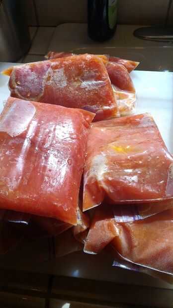 Ahora voy a tener 10-12, bolsas de plástico 3 taza digno de tomate salsa preparado para añadir a cualquier receta para salsa de tomate, para hacer mi propia salsa para pasta, etc.... Con tomates orgánicos, deliciosa del mercado del agricultor. Usted podría preguntar por qué no utilizar su propia cosecha propia... tan rápido como nos sea posible ;) comemos todos los frescos
