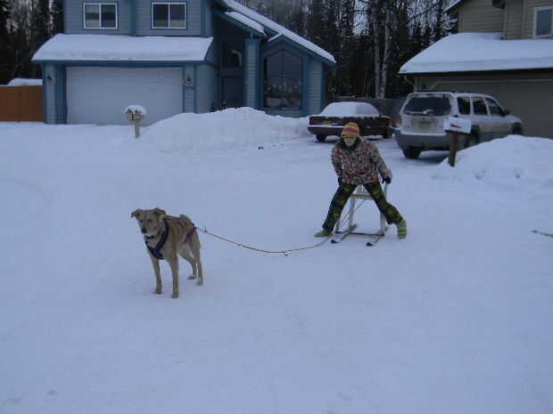Darle una oportunidad. Es mejor ayudar al perro conseguir ejecutando un poco parado en la barra y patadas. Utilice Fred Flintstone técnicas de frenado y parada. Una vez que empezar es un muy divertido paseo.