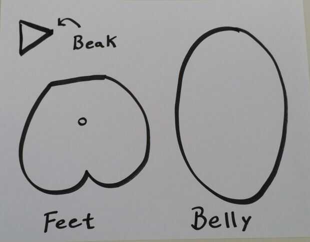 1. vientre es sólo un óvalo recortado de papel de copia de ofwhite. 2. pies y pico se cortan en cartulina amarilla o carpetas de archivo de manila. 3. usando el objeto punzante (abrecartas) hacer agujero en pies para Appliqués baloon. 4. doble pico por la mitad a triángulo forma.