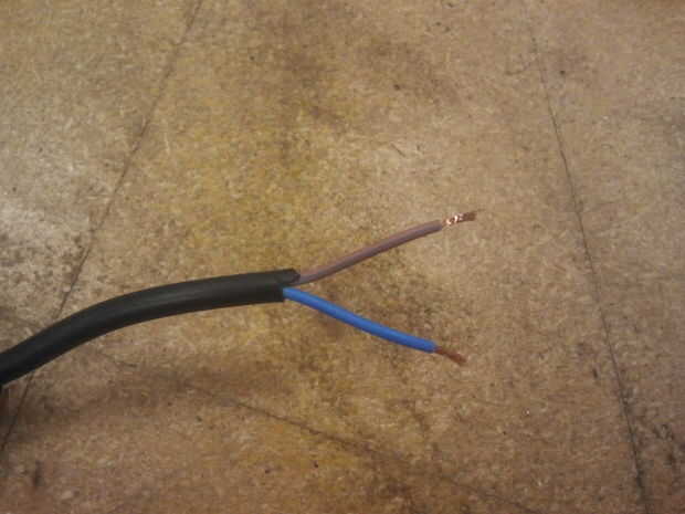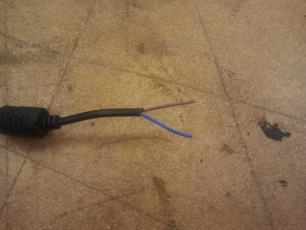 Utilice la pieza de alambre de corte de los alicates para cortar la punta redonda y exponer los dos cables pelados. Además, la tira alrededor de una pulgada de la vaina con dos cables juntos.