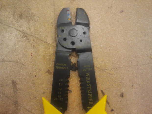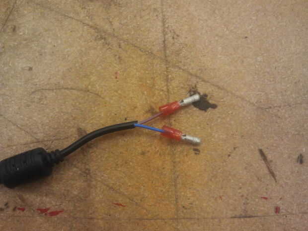 Ahora basta con cada alambre suficiente para obstaculizarlo. Esto es aproximadamente 1/4" para mis conectores crimp. Después se pelan los cables, prensar los conectores. Asegúrese de poner un conector macho en los dos cables.