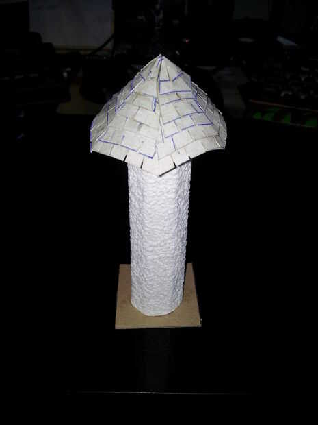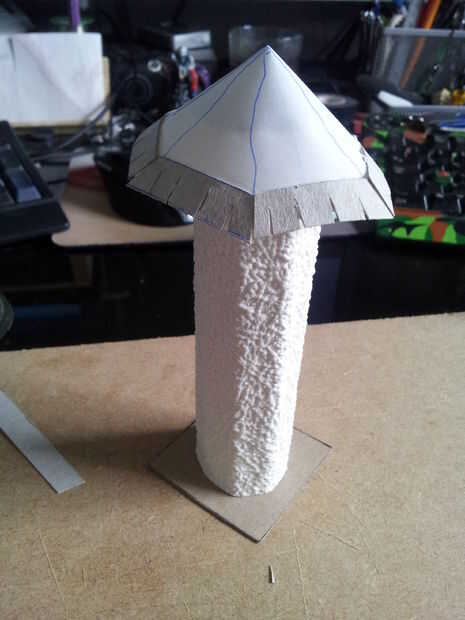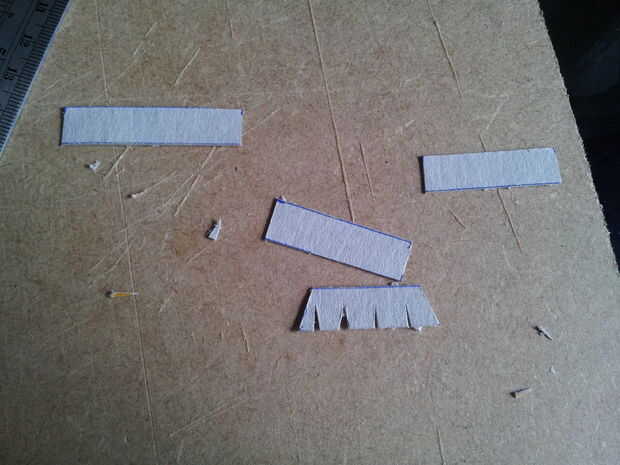 Usando el cartón más fino (una caja de torta de jaffa a mi me funciono y proporciona un sabroso aperitivo al mismo tiempo), aproximadamente, cortar tiras de la tarjeta y corte muescas como tejas.