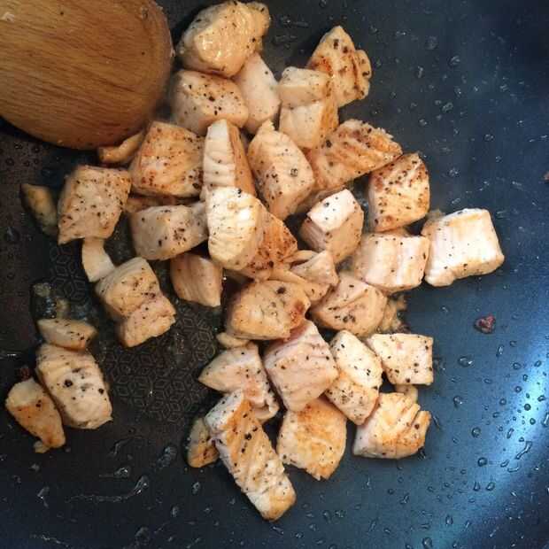Calentar un wok con aceite de sésamo. Añadir los pimientos de Sichuan si usted las está utilizando, y después de un minuto echar el salmón junto con una cantidad abundante de sal y pimienta. Seguir lanzando alrededor como usted no quiere crujiente.