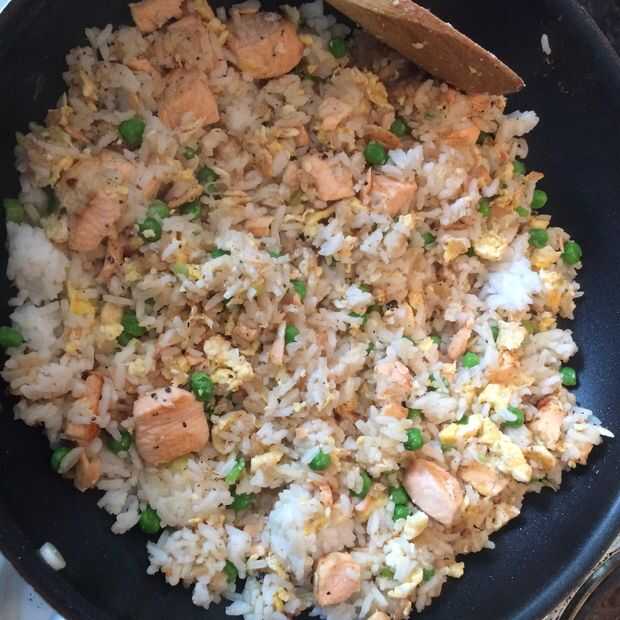 Rápido y delicioso: el salmón y las sobras de arroz (3 / 4 paso)