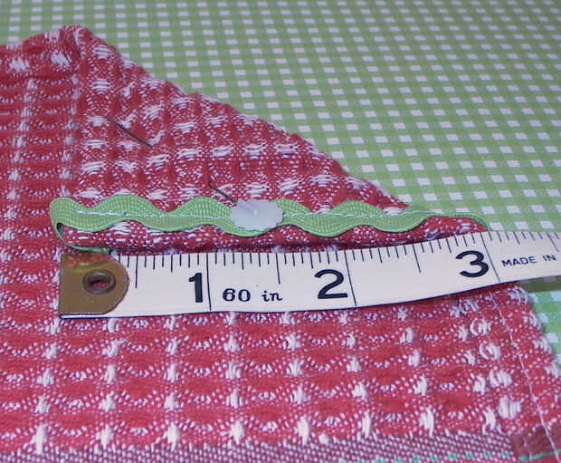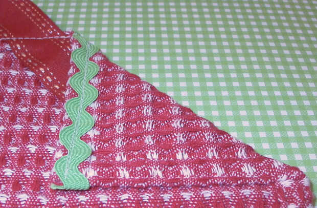 A continuación, doble hacia abajo las esquinas de su delantal (al revés) de tres pulgadas como se muestra en el cuadro 3. Tome la cinta del cuello e inserta en la esquina hasta que el borde está cubierto por la solapa de la esquina. Véase el cuadro 4. Empezar a coser la solapa hacia abajo por puntadas durante la costura ajuste (pespuntes al inicio), cuando llegas al punto del pivote y coser al borde y pespunte entonces un par de puntadas. Repita para el otro lado.