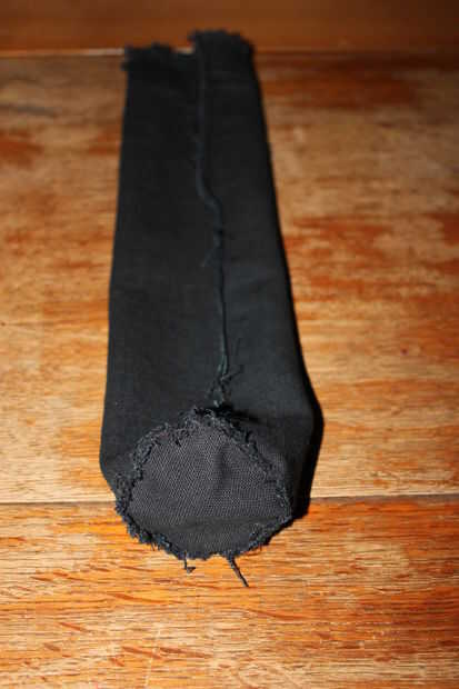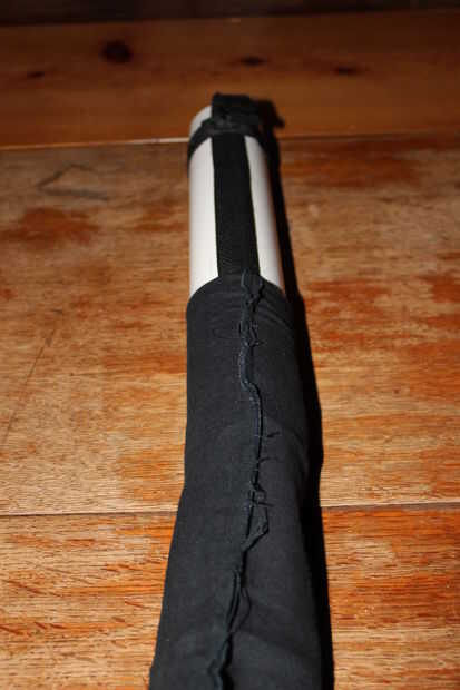 Envuelva la tela de adentro hacia fuera libremente alrededor del PVC y alfileres. Sepárela y coser hasta hacer un tubo. cortar un círculo de lienzo y coser un extremo del tubo.