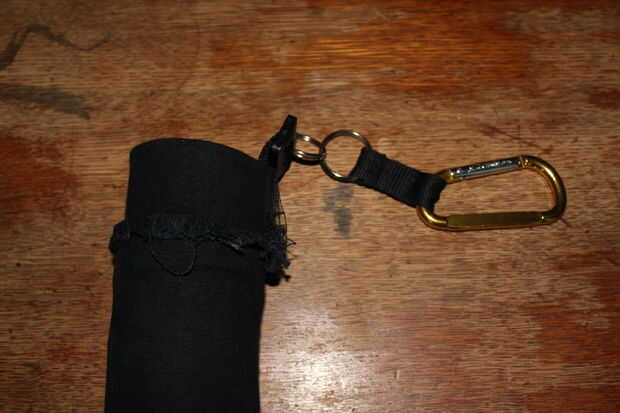 Tomar un llavero de mosquetón y fije a las correas de nylon que puede acortar la aljaba en sus cintos.