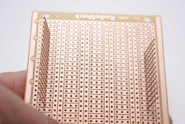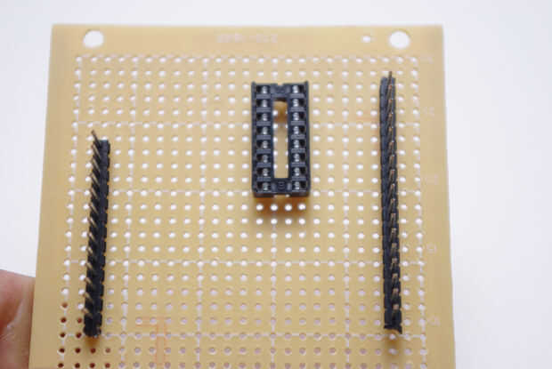 coloqué el zócalo del IC que los alfileres alinearon con los contactos de la Junta donde había tres contactos así. Esto permitirá más adelante para conectar las clavijas de puente h con los pernos de encabezado que se conectarán con el Arduino. La segunda imagen pretende mostrar esta las clavijas del enchufe son difíciles de ver, pero que están ahí que sobresale a través de la Junta.