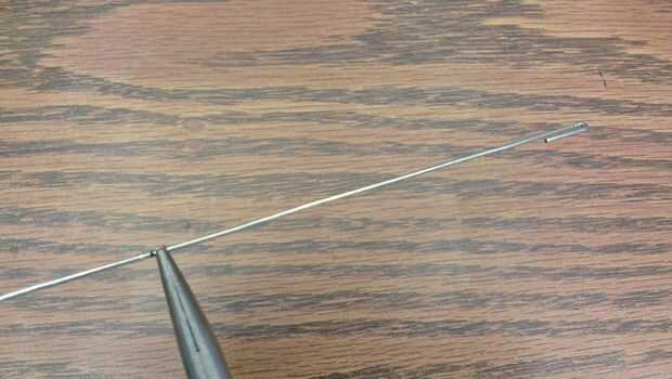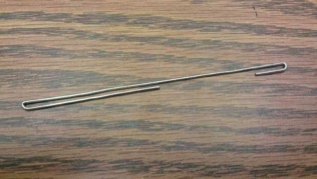 Iniciar este paso por enderezarse hacia fuera el resto de su clip.  Para hacer la última curva en el clip de papel, colocar y sujetar el clip de papel en el interior de la marca que acaba de hacer con la punta de los alicates de punta.  Suavemente doble el resto enderezado del clip de papel alrededor de la punta de sus pinzas.  Asegúrese de que la curva está en el mismo lado del clip de papel como la primera curva que hiciste.  Asegúrese de mantener las piernas de la forma de "U" paralelo.