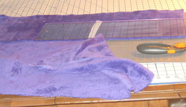 Medir el ancho entre la abertura del cuello y el borde donde terminan las mangas. Dividir por la mitad y luego restar la mitad de una pulgada. Utilice esta medida para cortar de la capa inferior de tela justo al lado de la capa superior de la manga. El corte será desde el exterior y final casi a medio camino a través del cuello. He marcado este punto con cinta. Una regla clara que acolcha y desmalezadora ayudan a hacer esto, vaya rápidamente y todo alineado para no cortar la capa superior. Si no tienes un cortador rotatorio, que está muy bien, usar sólo la capa superior como guía para ver dónde cortar.