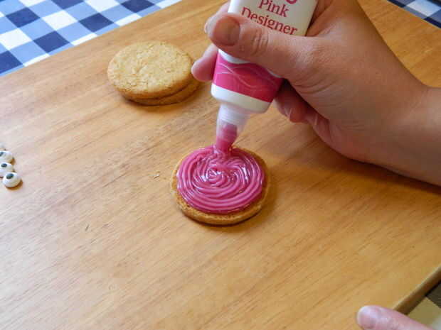 Flip boca abajo la galleta y cubrir la mayoría de glaseado rosa. En el fondo, añadir un poco extra, esto ayudará a sostener posteriormente la parte superior