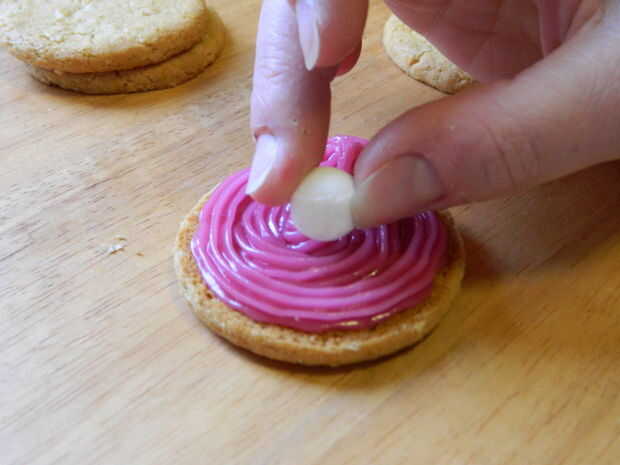 Agregar el dulce blanco redondo en el frente de la galleta en el glaseado