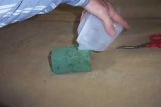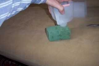 Presione la parte superior de la jarra en la "espuma floral" aproximadamente 1/2 a 3/4". Doble la mitad superior de la jarra a un lado hasta que se rompa de la espuma floral - esto hará un pequeño "enchufe" en la parte inferior para no derramar el suelo.