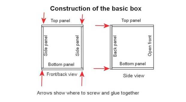 Primero es pegados y atornillados a los lados, superior e inferior, y entonces la parte trasera también es pegada y atornillada, para formar la caja con un frente abierto. Encontré más fácil primero Taladre los orificios en cada borde y tornillo todo juntos sin pegamento y luego desenroscar un panel, encolarla y vuelva otra vez y pasar al siguiente panel, terminando con la parte trasera.