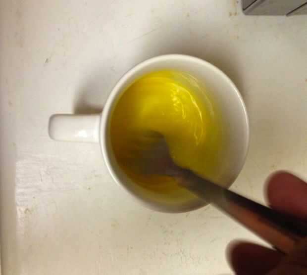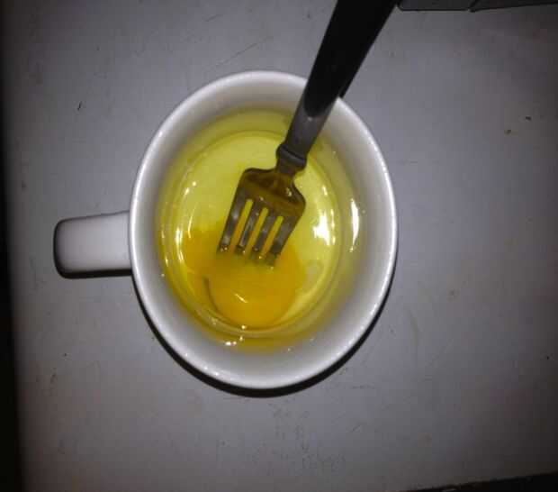 Asegúrese de que no hay partículas de cáscara y batir la yema de huevo con un tenedor, unos 20 segundos o hasta que el líquido es el mismo color, generalmente un color amarillo pálido.