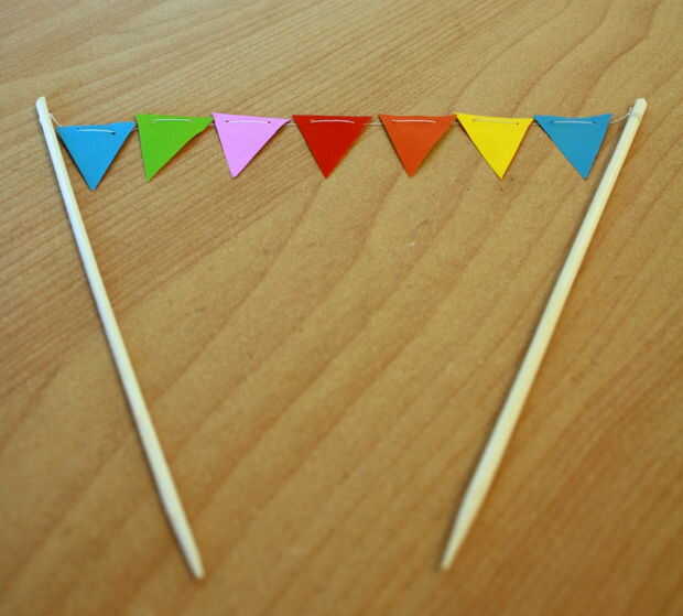 La longitud del empavesado es totalmente hasta usted. Una vez que sientes que tienes suficientes triángulos, el extremo alrededor de la brocheta de segunda y dos veces como antes. Otra vez, palillo del pegamento del frotamiento en el hilo puede ayudar a permanecer en el lugar y debe secar para ser invisible.