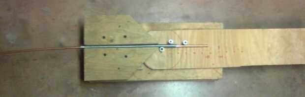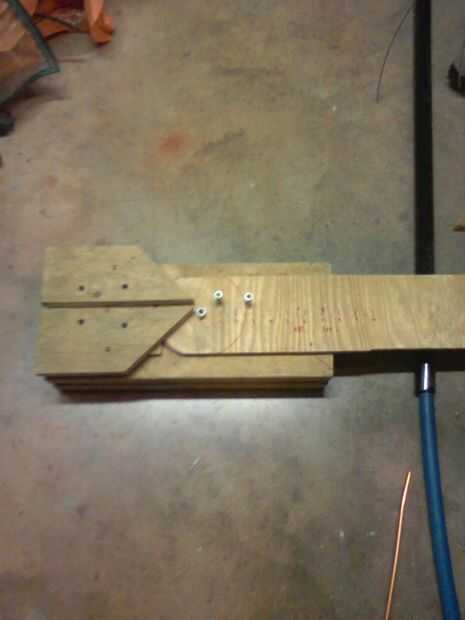Step5: Tire un pedazo de tubería hacia fuera a través de la dobladora. Utilizando un par de tornillos cortos que no penetran en la parte inferior de la sección rota y un par de línea de separadores (opcional) todo en recto. Los dos tornillos y espaciadores deben proporcionar una superficie incluso paralela para doblar el tubo.