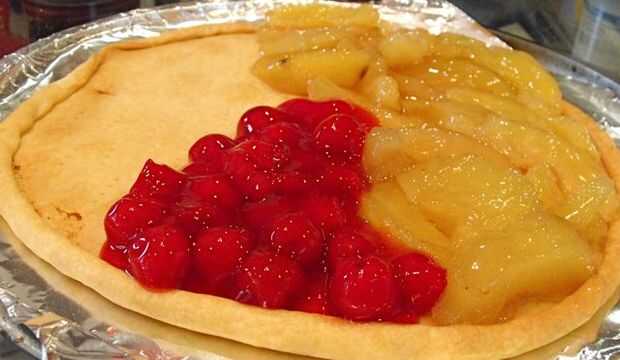 1) uso una cucharadita colocar el relleno sobre la corteza de la parte inferior de la fruta. Cubrir 1/2 de la corteza con una fruta. Entonces cubra aproximadamente 1/4 de la otra mitad con un segundo sabor. Utilice el tercer sabor para cubrir el resto de la corteza.
