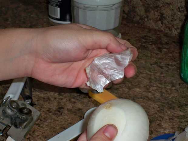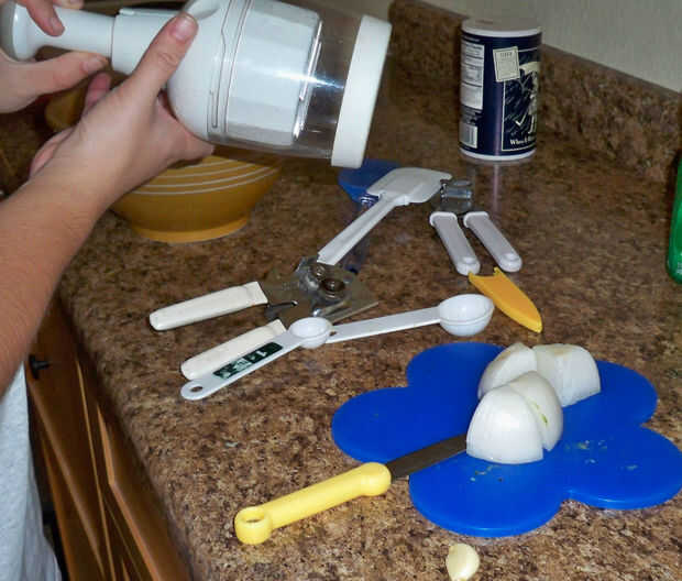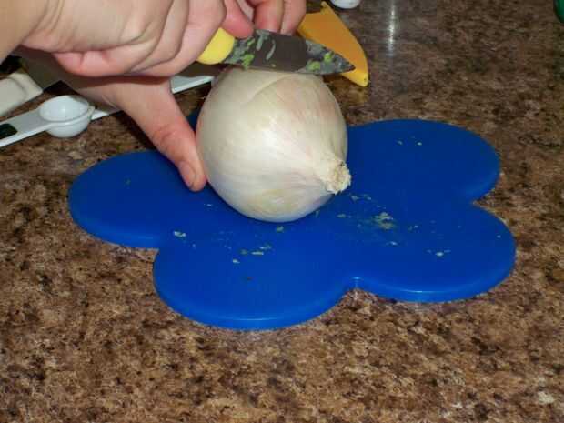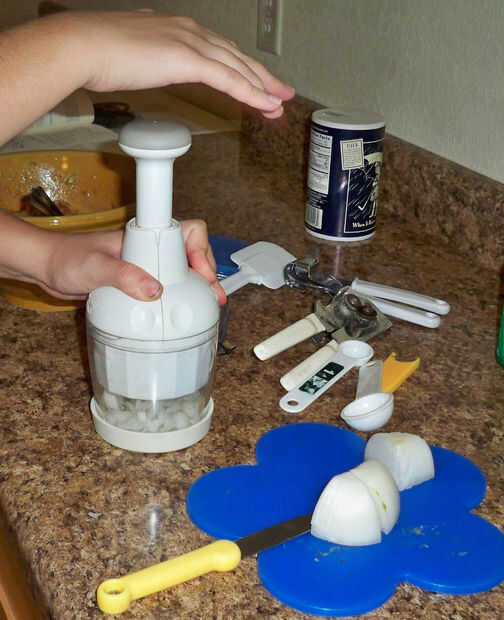 Picar la cebolla, con el picador de cebolla. Antes de picar la media cebolla, cortada en trozos más pequeños para picar.
