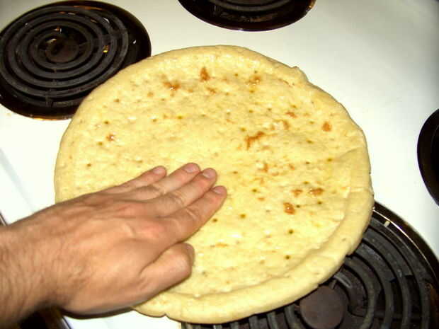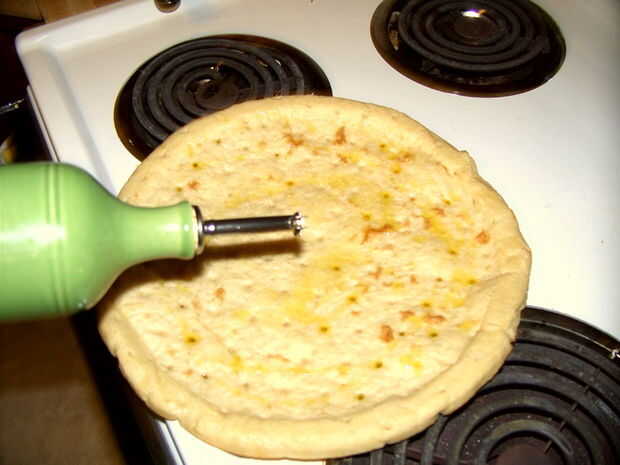 a continuación tenemos que asegurarnos de que nuestra masa se cocina correctamente mediante la adición de aceite de oliva a la superficie de la corteza. Esto también agregará un poco de sabor a la mezcla (más o menos sabor dependiendo de si o no han infundido su aceite de oliva con hierbas o especias). Vierte en cualquier lugar de 2 a 2 1/2 cucharadas de su aceite en la corteza. Esparza uniformemente con el dorso de una cuchara, un hilván cepillo o utilizar mi método favorito: su mano.
