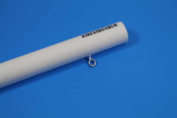 Taladre un pequeño agujero y atornille los ganchos de ojo en los extremos de la de los brazos de PVC. Les coloqué aproximadamente 2 pulgadas en el extremo.