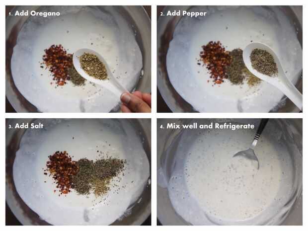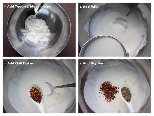 2) luego agregar las escamas del Chile, orégano, albahaca seca, polvo de pimienta y sal a la mezcla de yogur y mezclar todo bien.