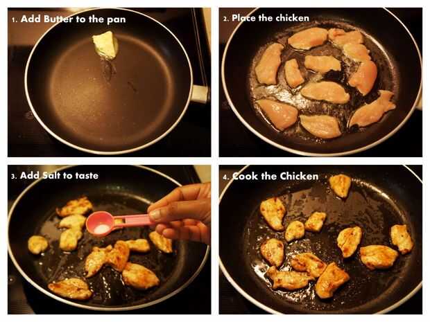 2) cuando la mantequilla se derrita añadir los trozos de pollo a la sartén uniformemente.