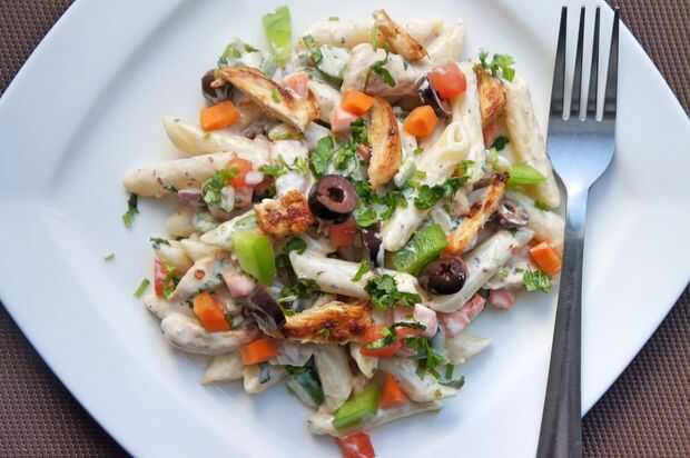 Rápido y fácil ensalada de Pasta pollo está listo para ser servido.