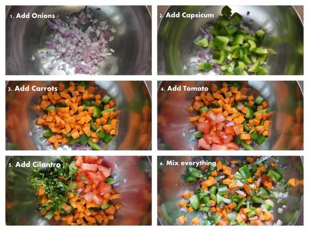 1) en un recipiente limpio, agregue las verduras uno por uno (cebolla, pimiento, zanahorias, tomates, cilantro) y mezclar bien