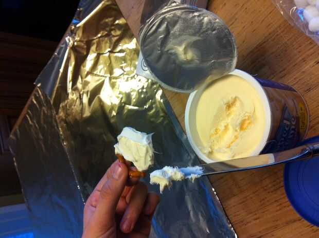 Lo primero que va a hacer es sumergir el pretzel en el glaseado blanco. (Sugerencia: que se separa el glaseado con un cuchillo de mantequilla lo hará más suave)