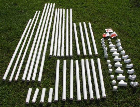 Para la construcción usé y mezcla de tubos Schedule 40 PVC y 200 PSI. Mi objetivo era reducir al mínimo el peso (y costo), y todavía mantener/aumentar al máximo la presión del agua y estabilidad (que estamos en un pozo de agua, por lo que la presión puede ser irregular, especialmente en verano). Los resultados fueron grandes, además de que es fácil moverse alrededor de la yarda y aún más fácil almacenar para uso posterior. Esta es la lista de piezas (adquirida de mi local Lowe):