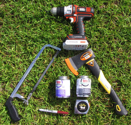 En cuanto a herramientas, simplemente usé una cinta métrica, un sharpie (para marcar la tubería), un hack Sierra para cortar el tubo, púrpura pluming imprimador y cemento y el lado embotado de un hacha para golpear ligeramente los tubos juntos.