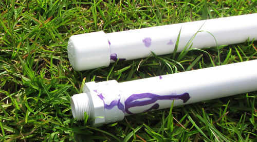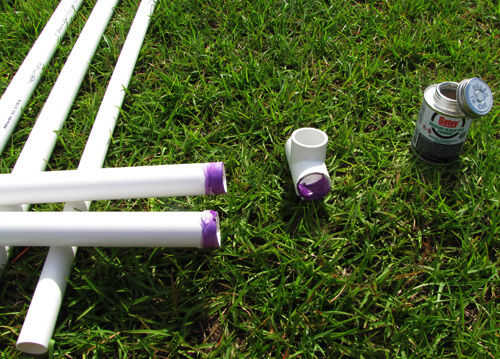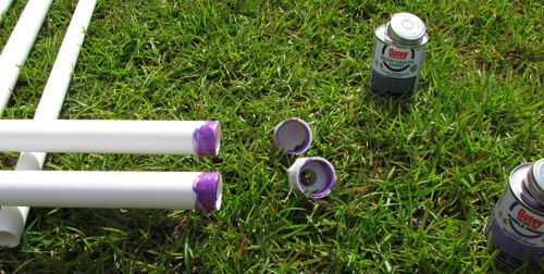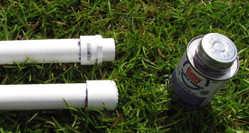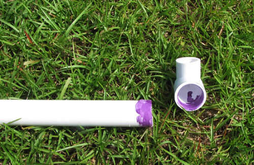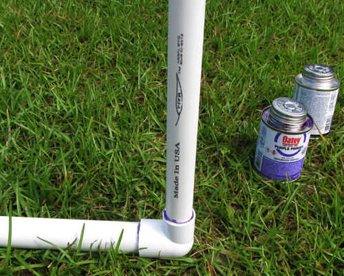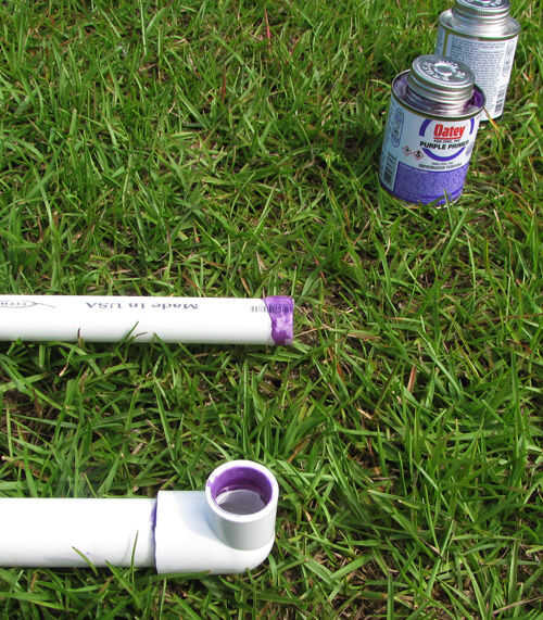 4. Aplique una imprimación, luego cemento en la parte superior de cada uno de los 72"(6 ft) 1-en tuberías de PVC Schedule 40 y en el interior de 2 x 1 - en diámetro x 3/4 diámetro 90 grados PVC Sch 40 codo de deslizamiento. Asegúrese de que esta conexión es tan cuadrada como sea posible.