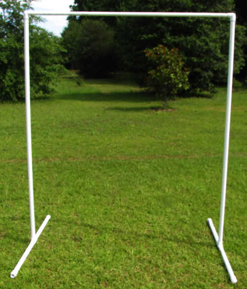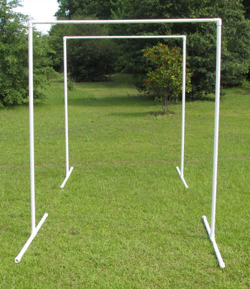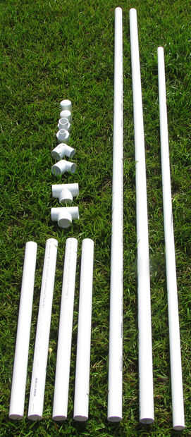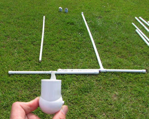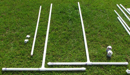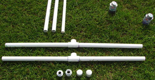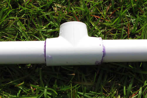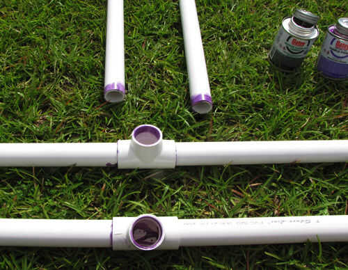 3. Aplique una imprimación, luego cemento a las salidas verticales de 2 x 1 de diámetro PVC Sch 40 Tees en las Asambleas de pie y a un extremo de 2 x 72"(6 ft) piezas de 1 tubo de PVC Schedule 40. Conectar, cada pieza de 72"(6 ft) 1-en tubo de PVC Schedule 40 para las salidas verticales de ambos 1-en diámetro del PVC Sch 40 Tees.