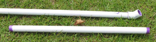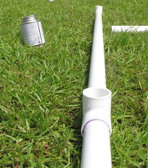 7. ahora, Aplique imprimador y cemento a los lados izquierdo y derecho de 1 x 48"(4 pies) de 1 tubo de PVC Schedule 40 y a la salida restante pasada en el 2 x 1 en Dia 90 grados PVC Sch 40 salida codos.