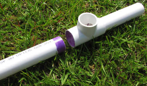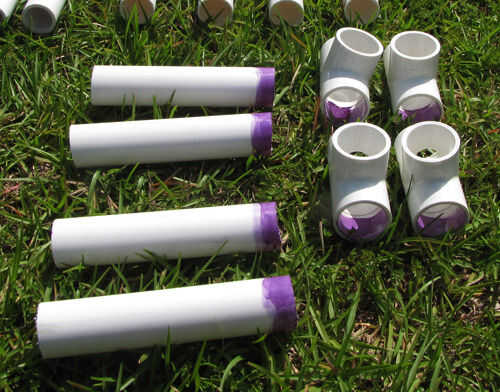 2. Aplique imprimante, luego cemento a ambos extremos de 1 x 48"(4 ft) piezas de 1 tubo de PVC Schedule 40 y a los lados opuestos de 2 x 1 en el Dia del PVC Sch 40 camisetas, además de 6" piezas de 1 tubo de PVC de 200 PSI, que sólo estaba trabajando.