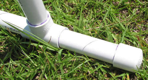 Conecte cada uno de los 1 Dia del PVC Sch 40 Tees + 6" piezas de 1 tubo de PVC de 200 PSI en cualquier lado del preparado 48" (4 pies) de piezas de 1 tubo de PVC Schedule 40. Asegúrese de que ambas conexiones son cuadrados (revisé mina contra un largo 2 x 4), como se trata de 1/2 la base de la "casa".