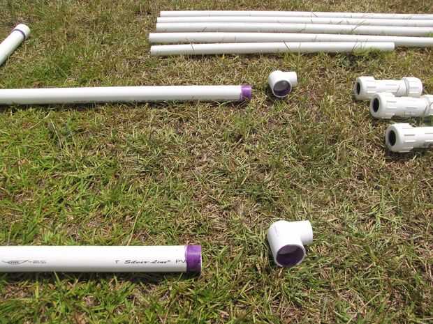 Este diseño fue basado en el "arco" en forma de estructuras de mi agua correr, con algunas actualizaciones. En primer lugar, porque uso camas levantadas para cultivar un huerto, necesita que sea 2 pies de alto en lugar de 6 pies de alto. En segundo lugar, porque quería ser capaz de desmontar el sistema de riego durante el invierno, necesito cambiar los conectores en la parte superior las piernas y en el primer y el último conjunto de tubos para los adaptadores de roscados.