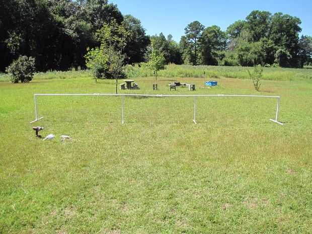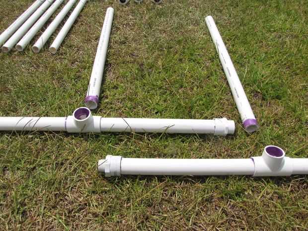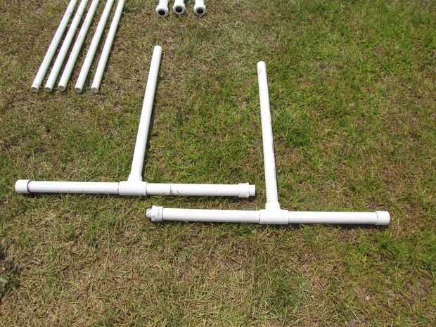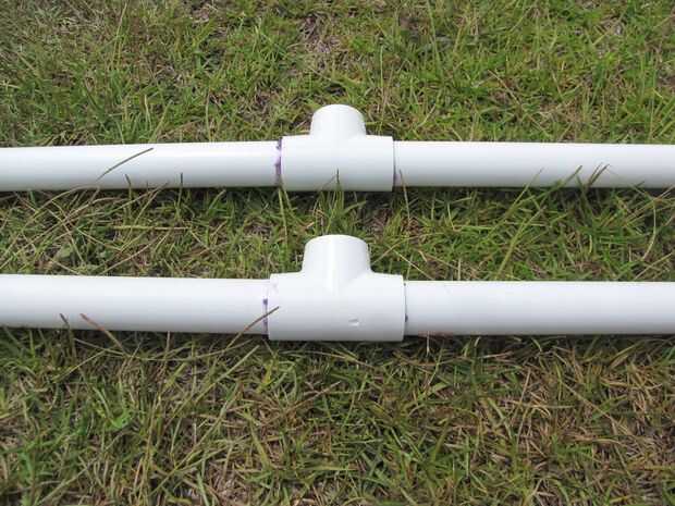 3. Aplique una imprimación, luego cemento a las salidas verticales de 2 x 1 de diámetro PVC Sch 40 Tees en las Asambleas de pie y a un extremo de la 2 x 24"(2 pies) piezas de 1 tubo de PVC Schedule 40. Conectar, cada pieza de 24"(2 pies) 1-en tubo de PVC Schedule 40 para las salidas verticales de ambos 1-en diámetro del PVC Sch 40 Tees.