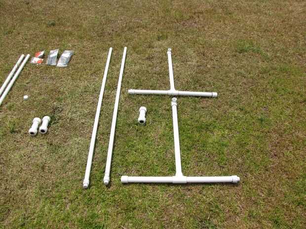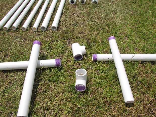 1. Aplique una imprimación primero pedazos de tubo de PVC Schedule 40 de 1" y en el interior, de cada lado, en 2 x 1 de diámetro PVC Sch 40 Teesde cemento a un extremo de 4 x 12" (1 pie).