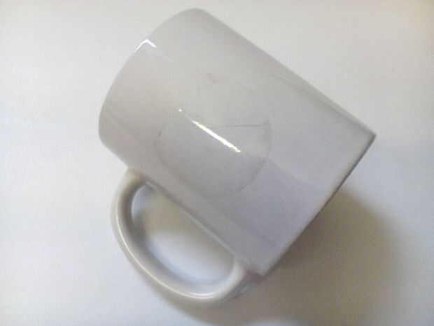 A continuación, fijar la plantilla a la taza. Si es papel vinilo o pegatina, entonces usted puede simplemente pegarlo, pero si estás usando el encerado o papel de congelador, necesitará calor hasta colocarlo en su lugar. Si sus cartas tienen 'islas' que no se unen a la plantilla principal, necesita transferir estos sobre demasiado. Recuerda que queremos que el círculo con el corte hacia fuera de carta, no el sí mismo!