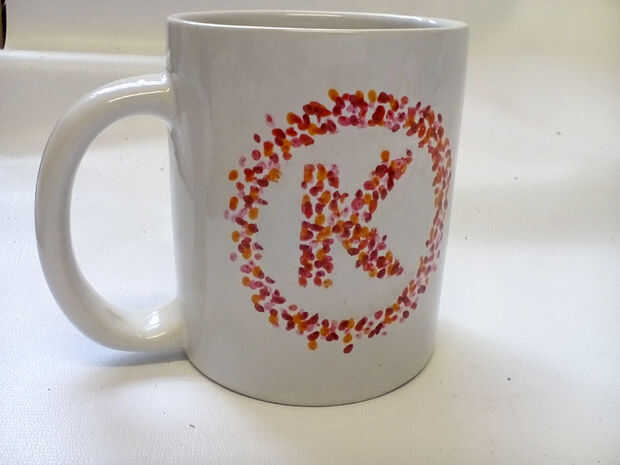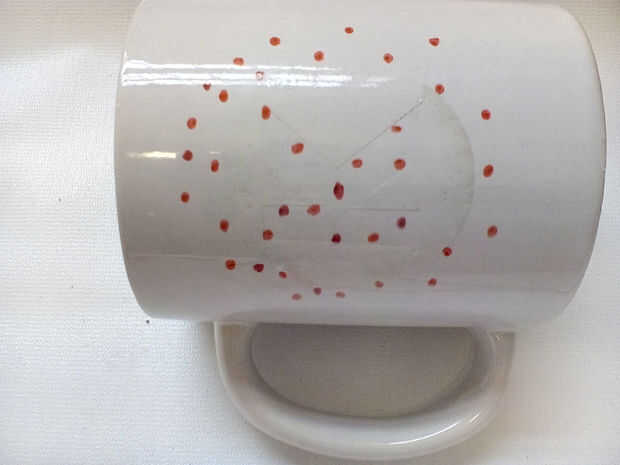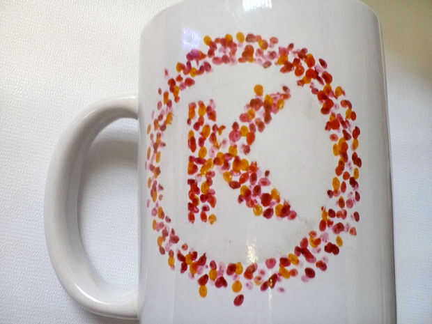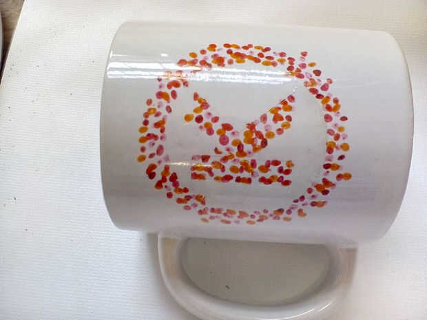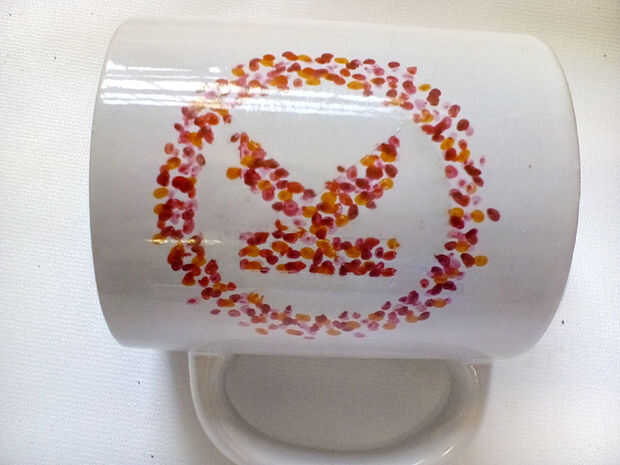 Para las tazas manchas, escoger cuatro o cinco colores complementarios de la pluma de porcelana. Comenzando con uno color luego agregar cada uno a su vez, construir puntos de color alrededor de la plantilla. Seguir construyendo el color para que la letra es claramente visible.