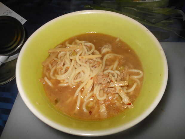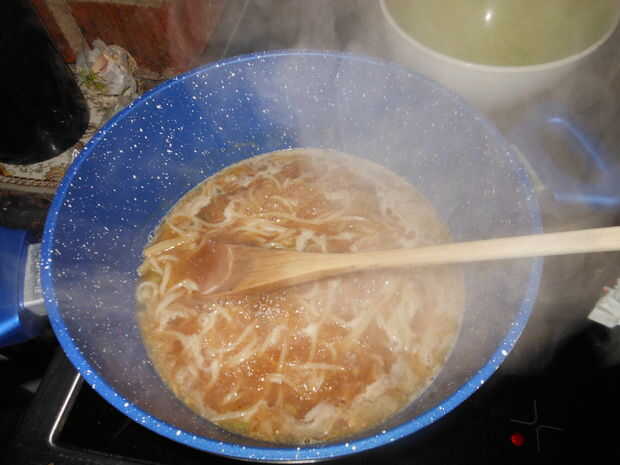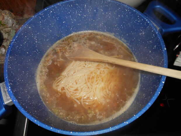 Foto 2: deje que los tallarines cocer hervir durante 3 minutos, así que estén cocidos. Mientras que esto está sucediendo ahora es un buen momento para probar su sopa y ver si necesita añadir nada más a él. No añadir ningún extra a la mía, pero todos los gustos son diferentes.
