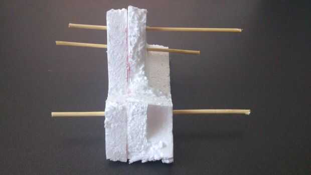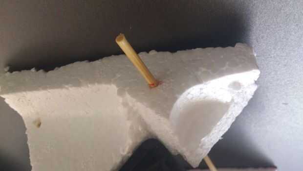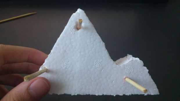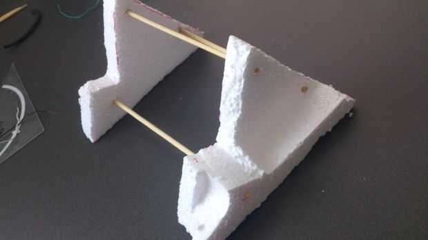 Cuando tienes que mover las dos piezas de espuma de poliestireno de unos a otros hasta el ventilador apenas le cabe en ella y marcan los extremos de los pinchos que se pega hacia fuera. Los cortan con tijeras usted y poner nuevamente en, no debería pegarse hacia fuera no más.