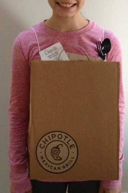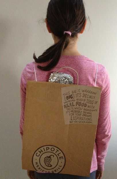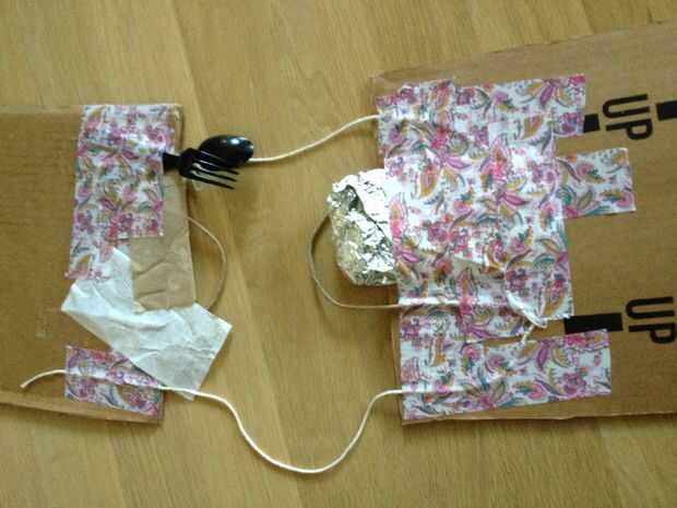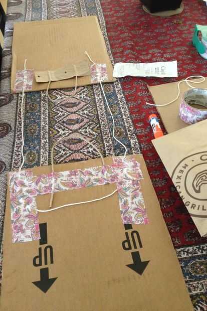 Use una caja reciclada, cinta, pegamento palo, cuerda y sobras de comida para hacer un traje lindo y fácil! Corte los dos lados de una caja, fijar cuerda y cinta adhesiva sobre la decoración.