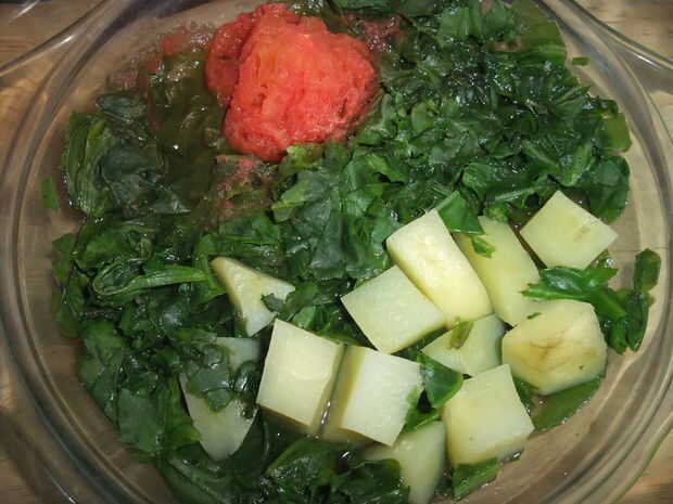-Poner espinaca, patata y tomate en un recipiente para microondas